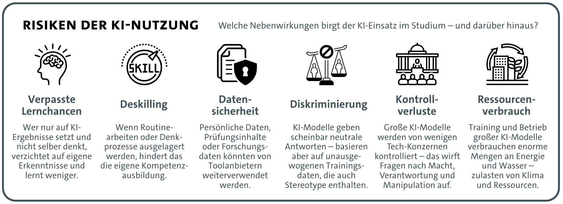 Der Einsatz generativer KI wirft nicht nur didaktische Fragen auf, sondern berührt auch Themen wie Datenschutz, Diskriminierung, Ressourcenverbrauch oder gesellschaftliche Verantwortung.